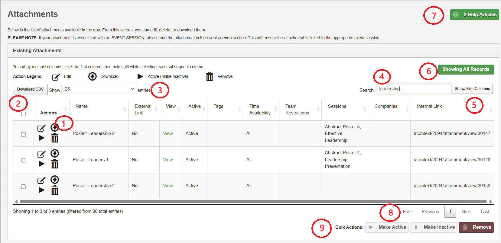 The actions you are allowed to take vary between contexts, but many of the functions remain the same throughout. Below is an example screen of one of the admin portal tables with further details.