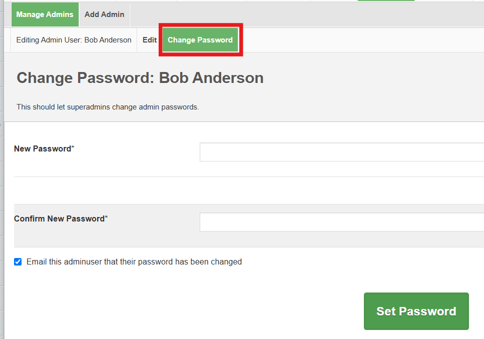 To add a new admin, select the Add Admin tab next to Manage Admins.