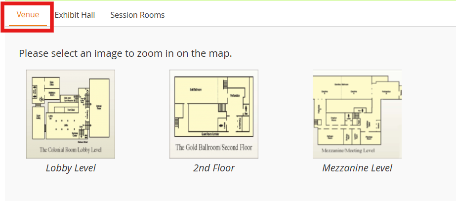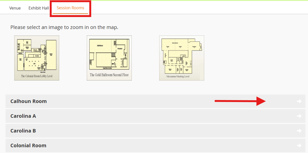 - Room locations will display under the map image. These rooms can be clicked on to see which agenda sessions are taking place in that room. See image below