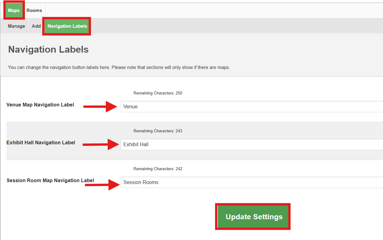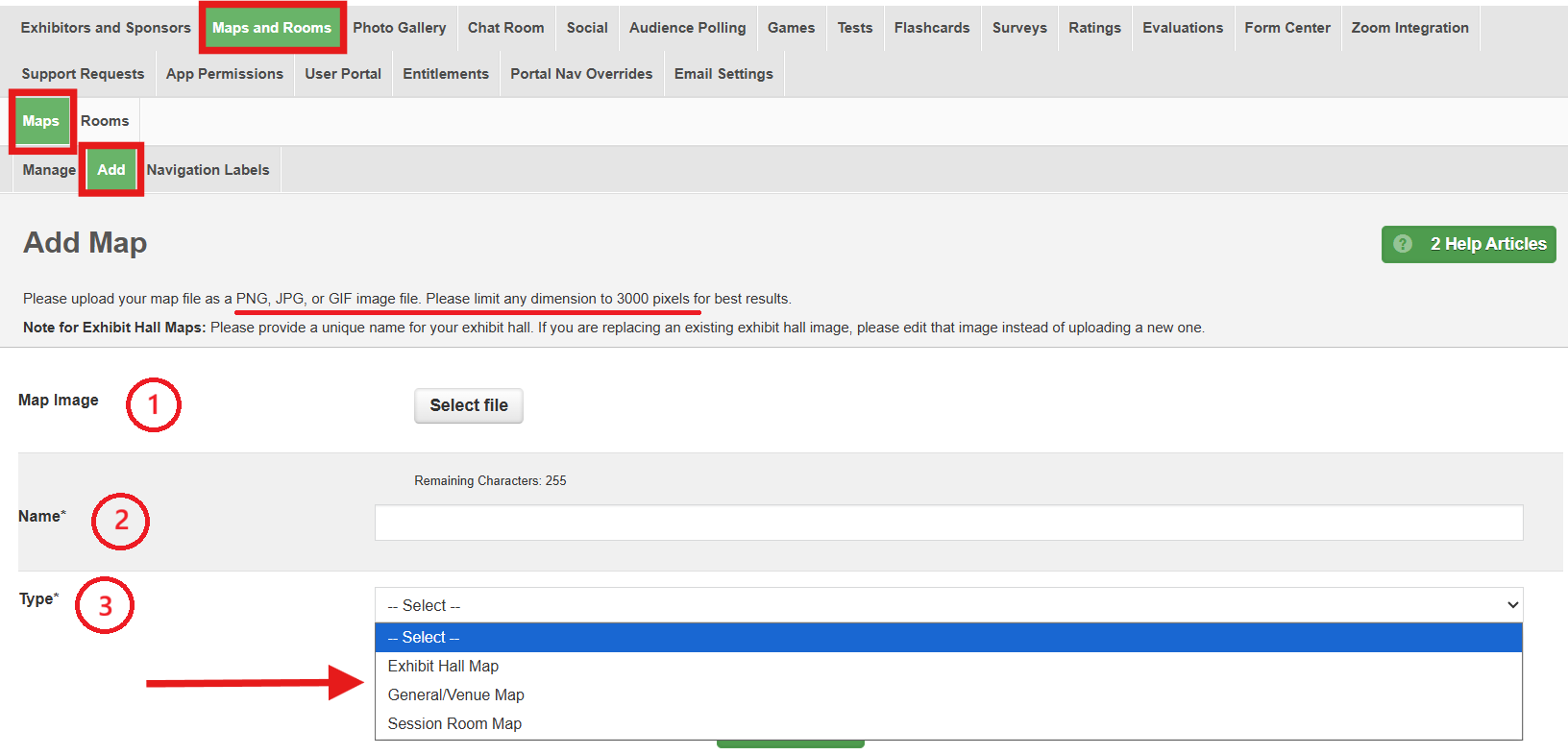 There are 3 types of maps that can be used in the app: Venue/General Maps, Session Room Maps, and Exhibit Hall Maps. Other map images can be added to sections of the app such as agenda sessions, notifications and email templates using the WYSIWYG editor. Click HERE for more information.