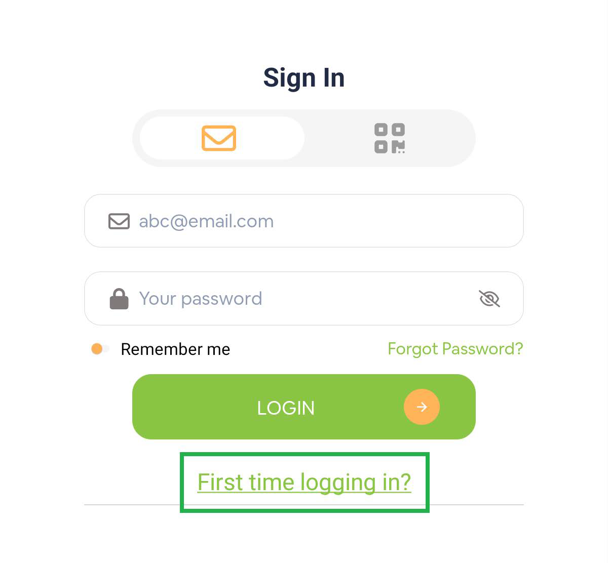 - Click on the "First time logging in" button (see image below)
