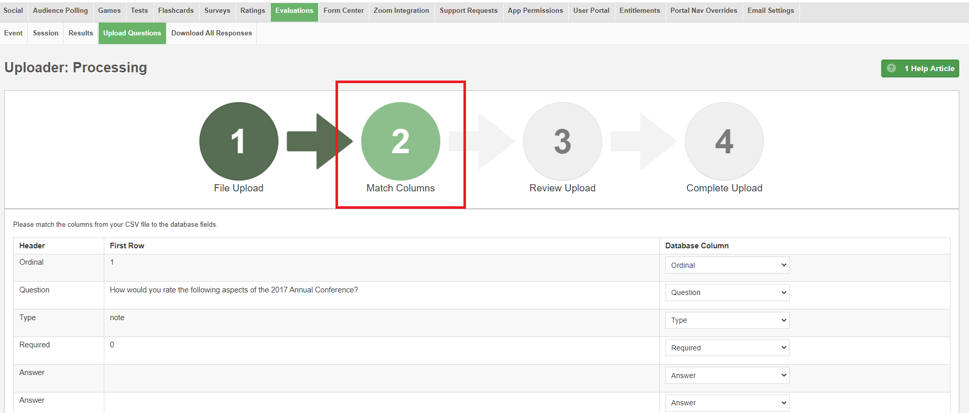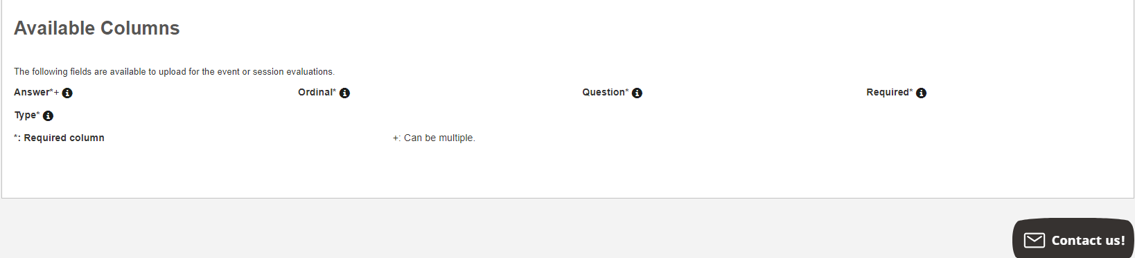 You can also upload all of your evaluation questions at one time. An example upload file is available to use to put your questions in the correct format.