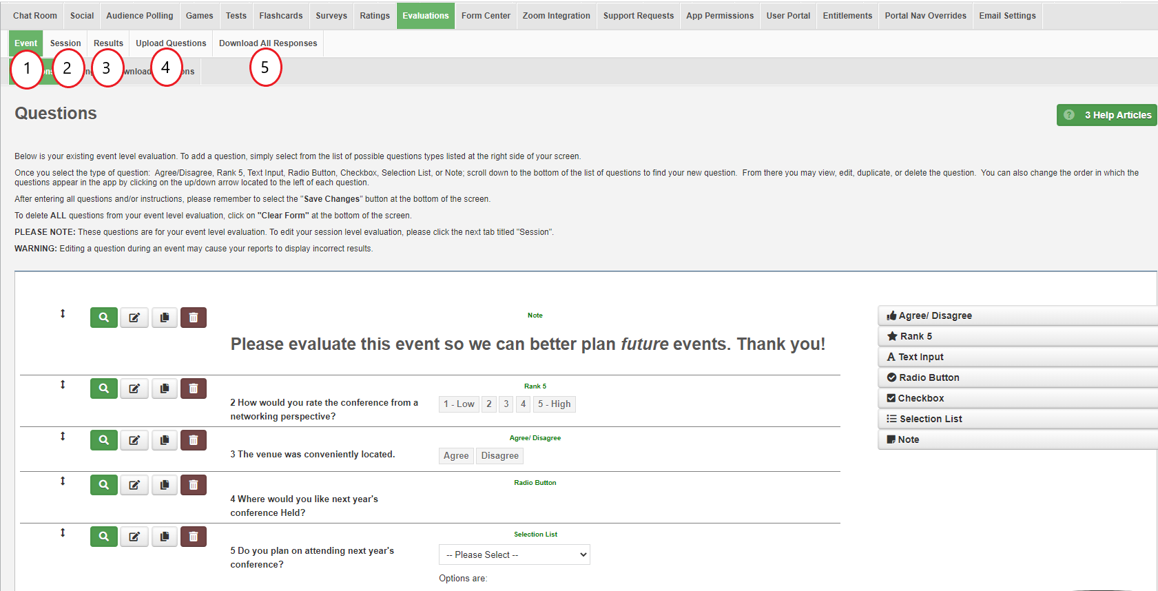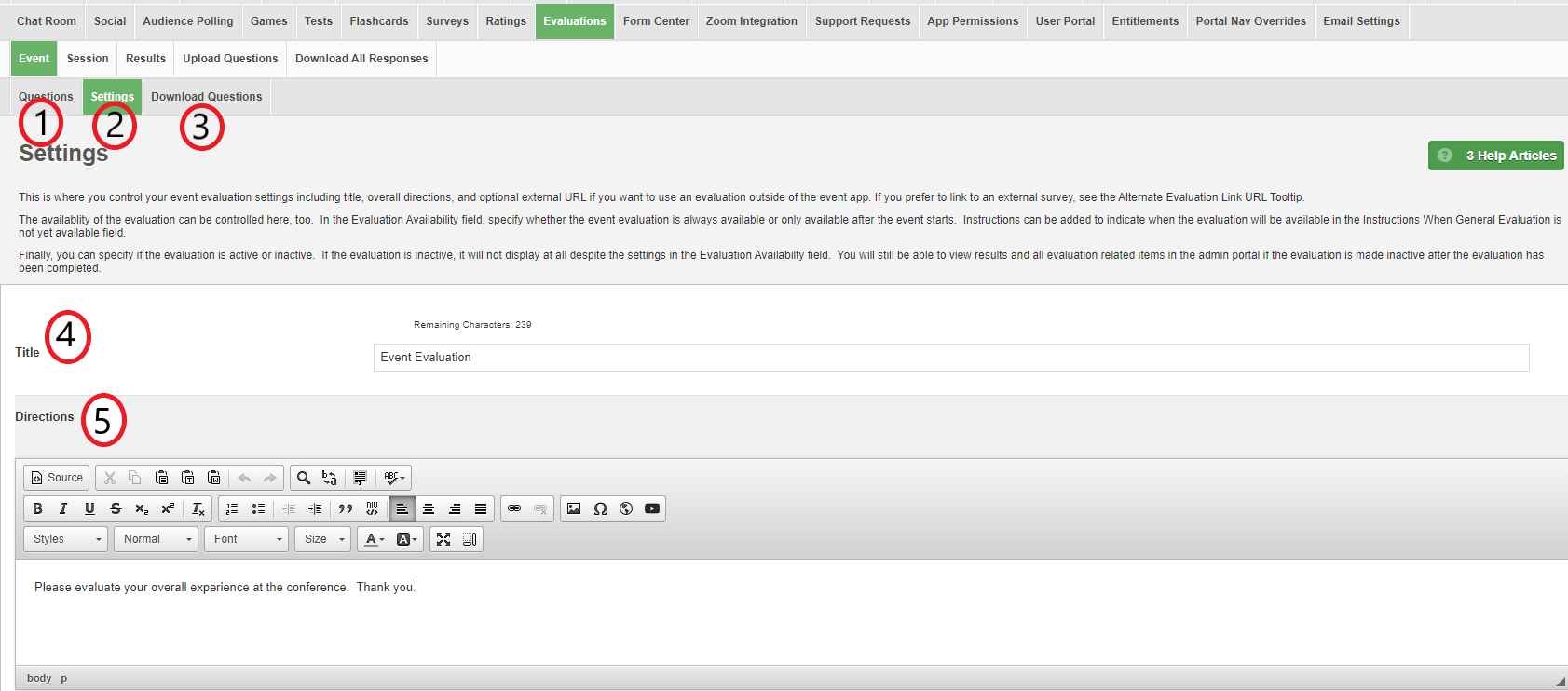 As shown in the figure below, you can manage the Questions, Settings, and Download Questions for an Event Evaluation. Click on Evaluation > Event > Settings.