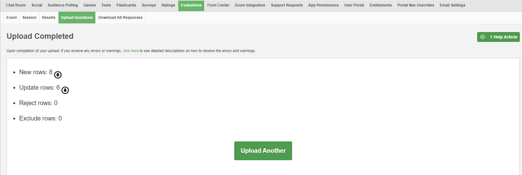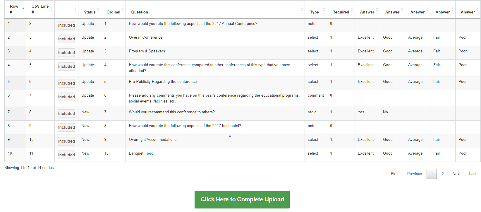 The next screen will show you the results of the column matching. When you click on each of the green buttons in the screen shot below, you will download a csv of the new, updated, rejected, or excluded records. Once you are satisfied with the mapping, click the "Click Here to Complete Upload" button to finish uploading the questions.