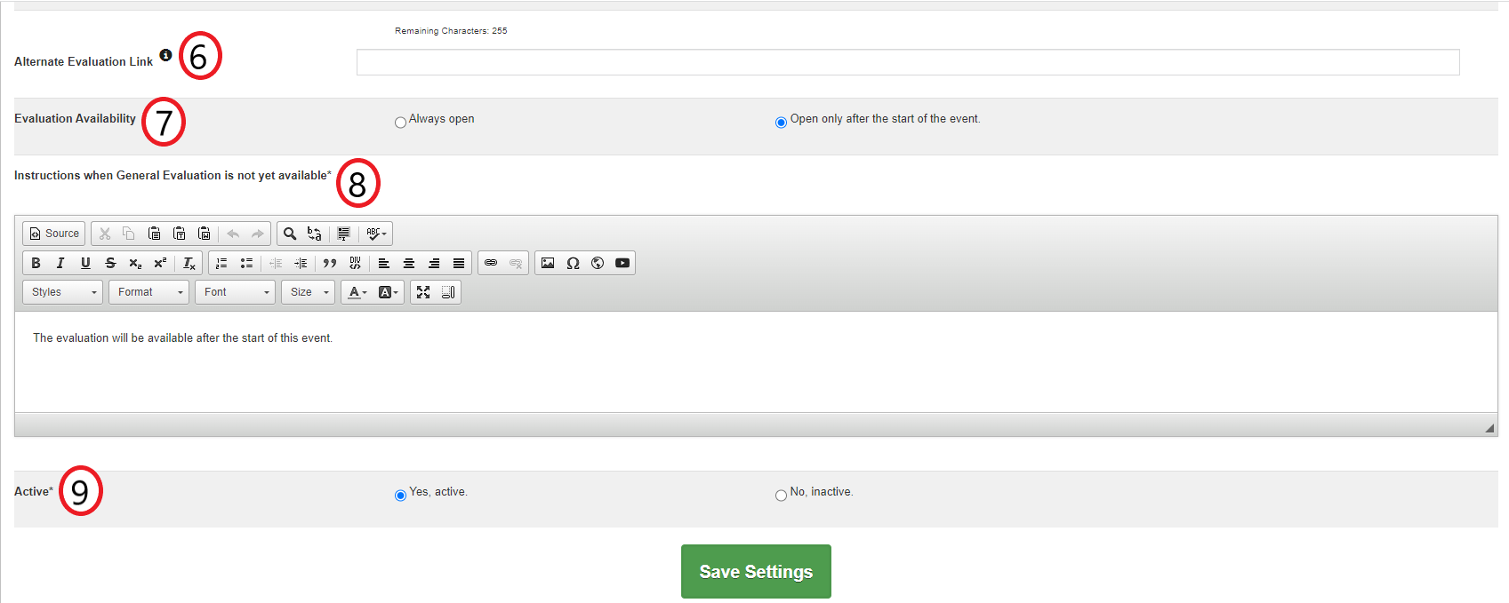 - Settings: where you provide a title, directions, and optional external link for your evaluations. By default the event evaluation isn't available to complete until after the event starts, but this can be changed in settings. Session evaluations can be set to open early in session settings as well. By default the session evaluation isn't available until the start of the session.