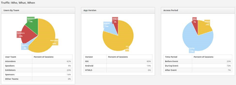 - Next comes traffic reporting. Users by team, app version, and access period are all shown in visual pie charts. You can see an example of this screen below.