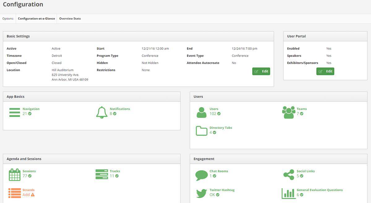 All app clients will now receive two new dashboards for their events and meetings: Configuration-at-a-Glance, which is a visual app setup guide, and Overview Stats, which provides event stats by the number. Configuration-at-a-Glance When logged into ...