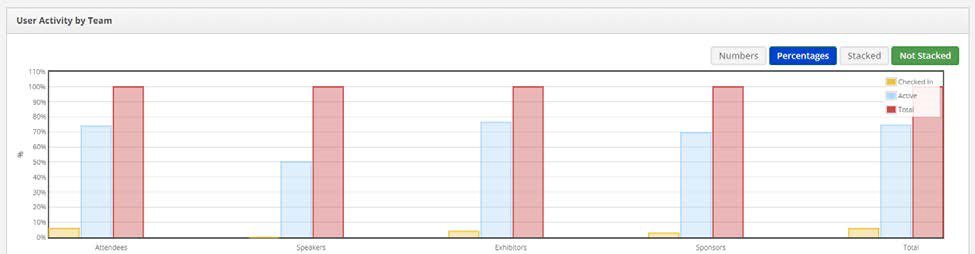 - The last set of charts are user activity by team. These show total number of users vs. who checked in and who was active in the app by team. You can also toggle between total number of users vs. percentages.