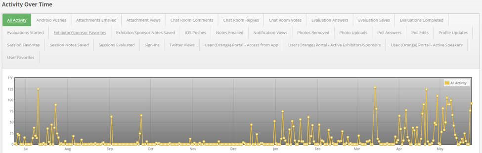 - Below these tables is your first graph, which shows user activity over time. Toggle between app activities to see where users took action over the course of your event.