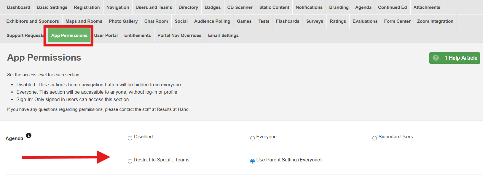- Disabled and Restricted to: specific Teams are not used in the default event permissions structure.
