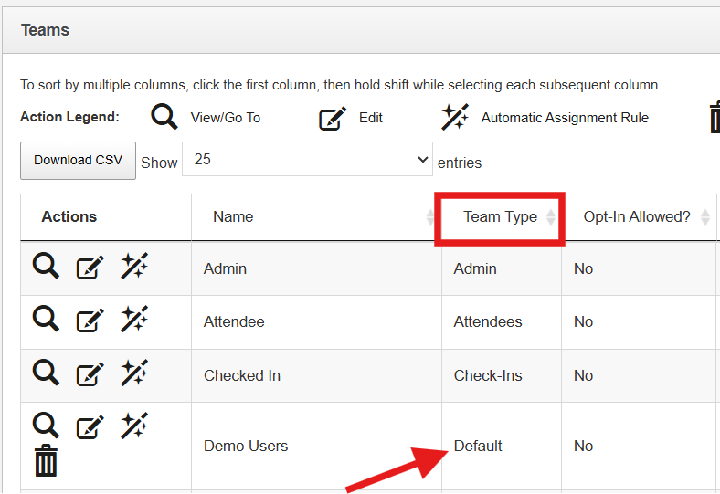 - If the team is a default team (admin, attendee, exhibitor, or sponsor, or checked-in), it will display the name in the "team type column", you will have limited edit options.