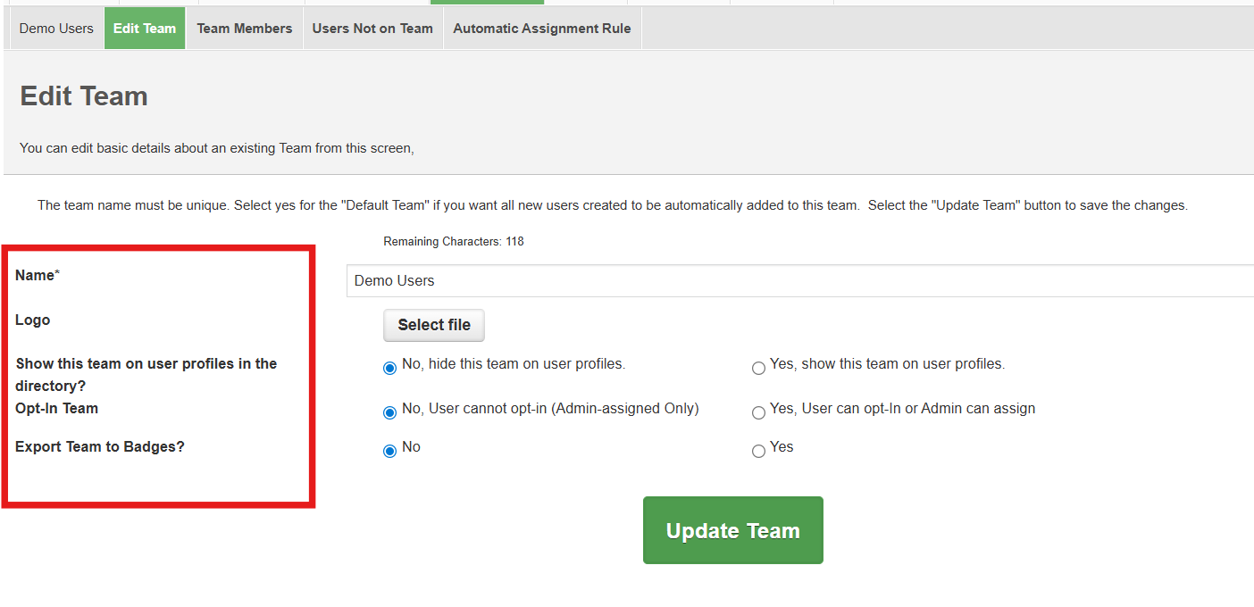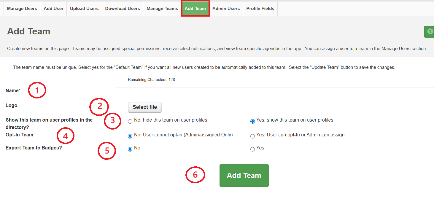 5. Export team to badges - this can be selected if the team label is set to display on a badge or if this team has a "team specific" (unique) badge. Contact