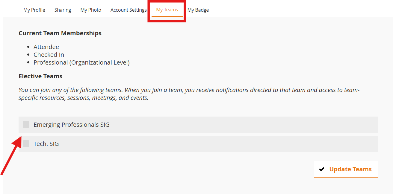 4. Opt-in team allows the attendee to select this team in the app by going to My profile > Teams