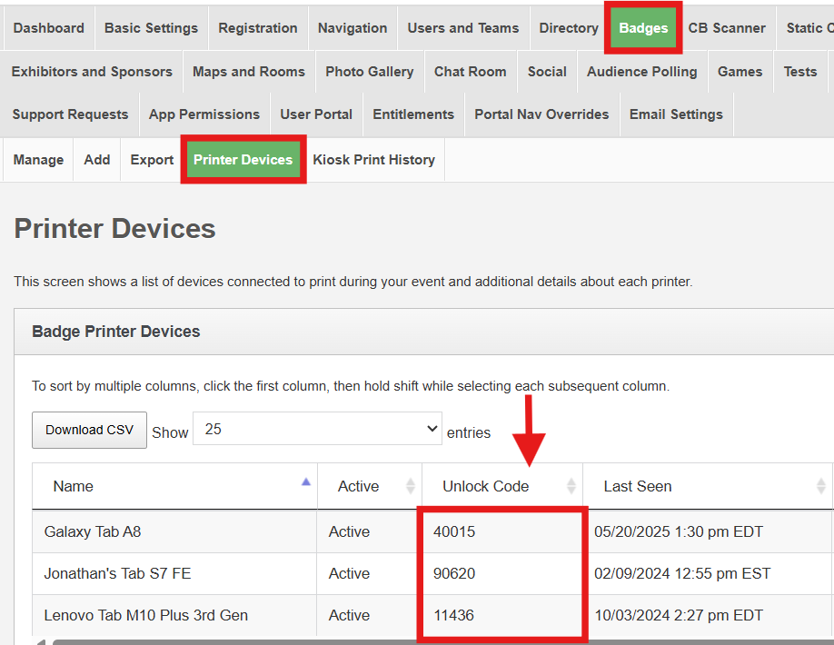 2. Type in the "device specific unlock code" - this is found in the badge's app prior to launching the tablet into kiosk. Or, you can find it in the admin portal by going to Badges > Printer Devices. You can also use the UNIVERSAL unlock code which was provided in the shipment email, "know before you go" email and during training.